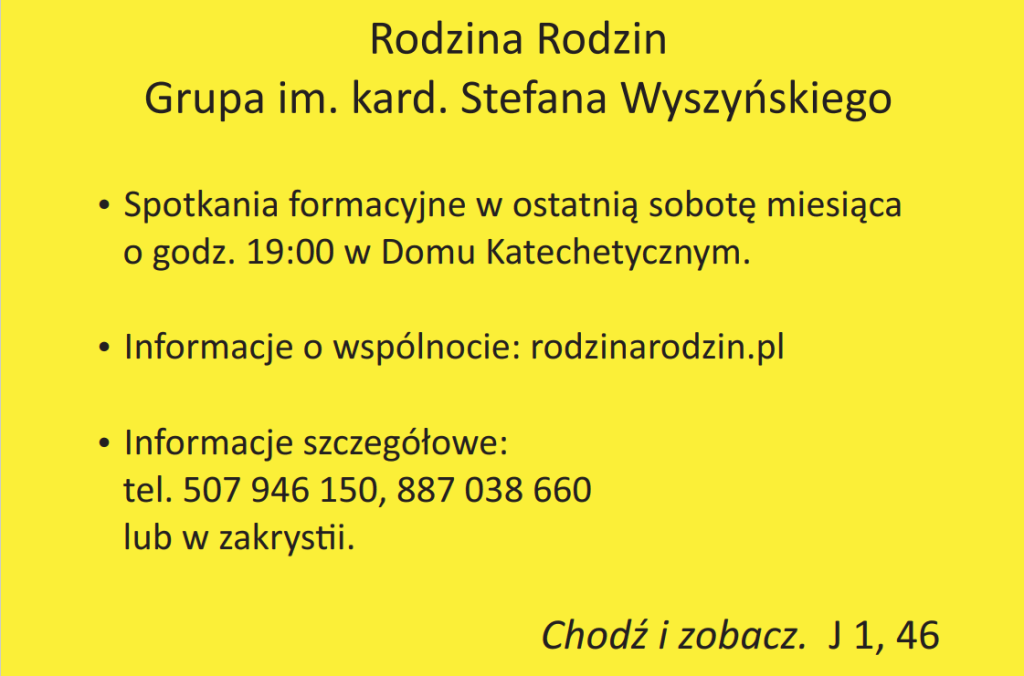Wszystkich zainteresowanych Ruchem Apostolskim Rodzina Rodzin oraz osoby pragnące dołączyć do naszej wspólnoty prosimy o kontakt, bądź z naszym opiekunem – ks. Piotrem, bądź o zostawienie informacji w zakrystii – u Państwa Kościelnych – członków Ruchu.